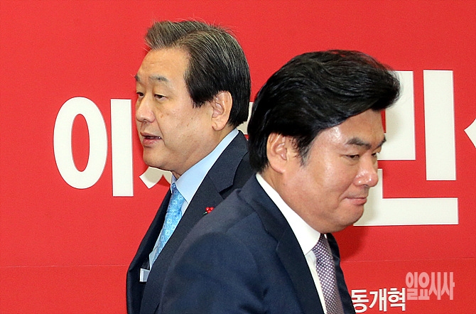 7일, 서울 여의도 국회 새누리당 당대표실에서 김무성 대표(사진 왼쪽)와 원유철 원내대표가 '노동법 관련' 박근혜 대통령과의 면담 브리핑 직후 자리에서 일어나고 있다.
