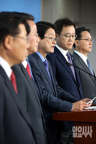 7일, 서울 여의도 국회 정론관에서 정희수 기재위원장 등 여당 소속 기재위원들이 야당 기재위원들에게 '서비스산업발전기본법' 합의 처리를 촉구하는 기자회견을 갖고 있다.