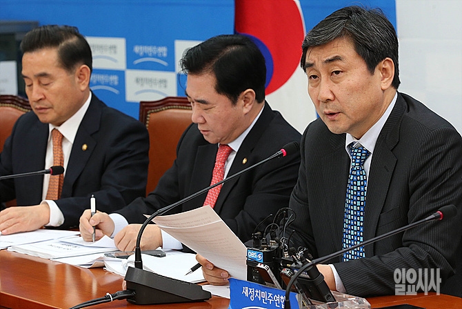 8일, 서울 여의도 국회 새정치민주연합 당대표실에서 열린 원내대책회의서 최재천 정책위의장이 발언하고 있다.