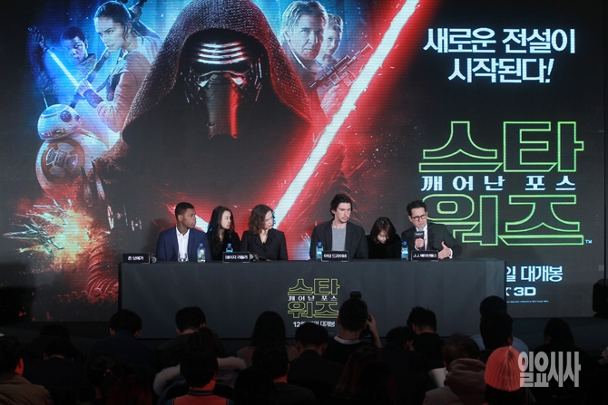 배우 존 보예가, 데이지 리들리, 아담 드라이버와 J.J.에이브럼스 감독이 9일 오전 서울 여의도 콘래드호텔에서 영화 <스타워즈: 깨어난 포스> 내한 기자간담회을 갖고 있다.