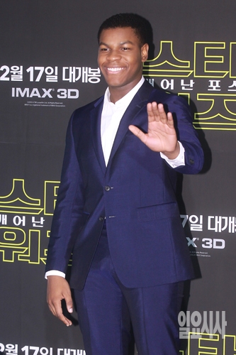 배우 존 보예가가 9일 오전 서울 여의도 콘래드호텔에서 열린 영화 <스타워즈: 깨어난 포스> 내한 기자간담회에서 포토타임을 갖고 있다.