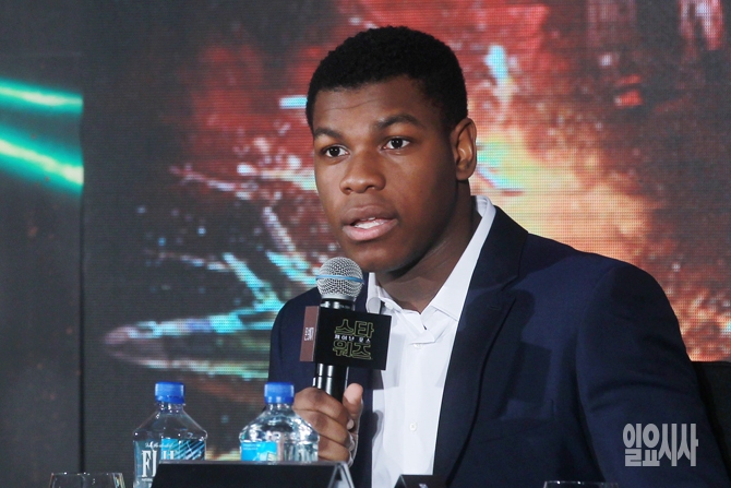 배우 존 보예가가 9일 오전 서울 여의도 콘래드호텔에서 열린 영화 <스타워즈: 깨어난 포스> 내한 기자간담회에서 기자들의 질문에 답변하고 있다.