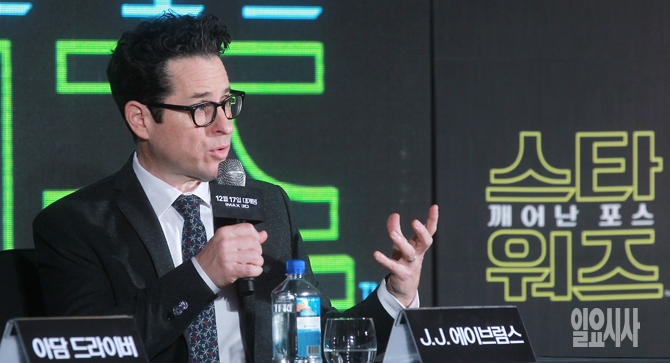 J.J.에이브럼스 감독이 9일 오전 서울 여의도 콘래드호텔에서 열린 영화 <스타워즈: 깨어난 포스> 내한 기자간담회에서 기자들의 질문에 답변하고 있다.