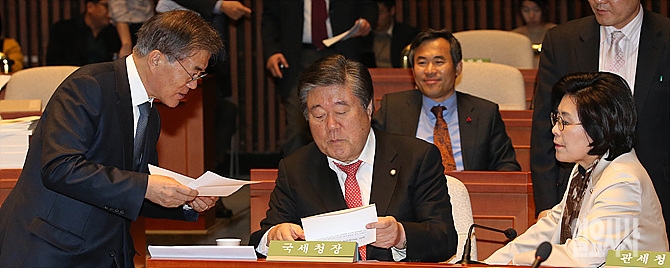 9일, 서울 여의도 국회서 열린 새정치민주연합 의원총회 도중 문재인 대표(사진 왼쪽)과 전순옥 의원 등이 논의를 하고 있다.