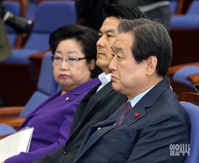 9일, 서울 여의도 국회서 열린 새누리당 의원총회 도중, 김을동 최고위원이 김무성 대표(사진 오른쪽)를 물끄러미 바라보고 있다.