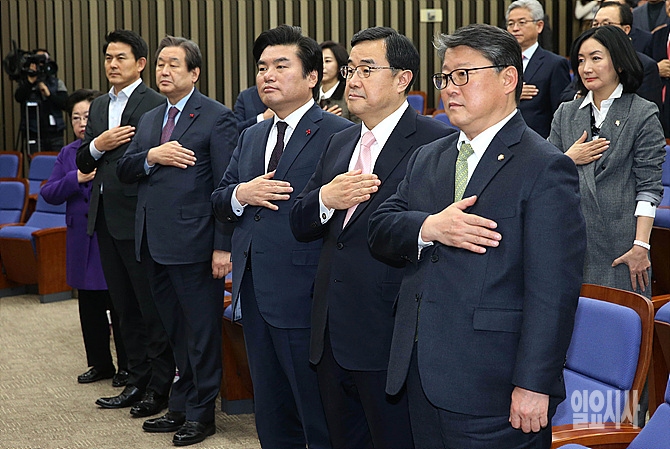 9일, 서울 여의도 국회서 열린 새누리당 의원총회에 앞서 김무성 대표(사진 왼쪽서 두 번째), 원유철 원내대표 등 원내지도부가 국기에 대한 경례를 하고 있다.