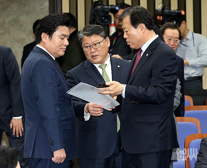 9일, 서울 여의도 국회서 열린 새누리당 의원총회에 앞서 원유철 원내대표(사진 왼쪽), 조원진 원내수석부대표, 이한성 의원(법사위 여당 간사)이 이야기를 나누고 있다.