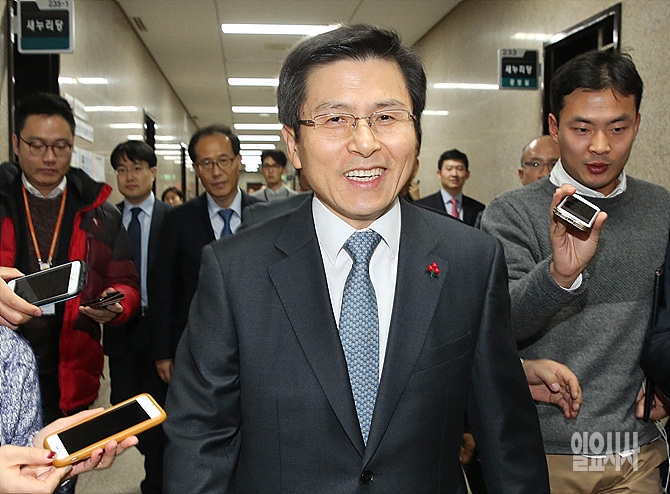 9일, 서울 여의도 국회 새누리당 김무성 대표를 찾아 면담했던 황교안 국무총리가 이동 중 활짝 웃음 짓고 있다.