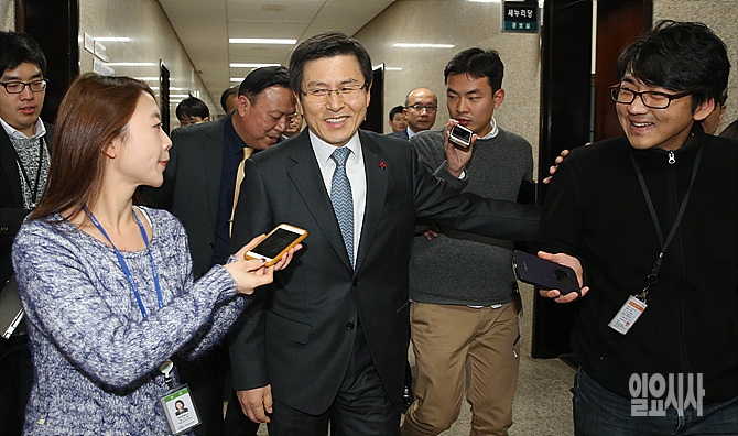 9일, 서울 여의도 국회 새누리당 김무성 대표를 찾아 면담했던 황교안 국무총리가 당 대표실에서 나오면서 취재진의 질문을 받고 있다.
