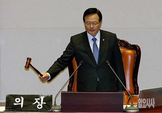 9일, 서울 여의도 국회 본회의장에서 제337회 정기국회 본회의가 열린 가운데, 정의화 국회의장이 개의를 선언하고 있다.
