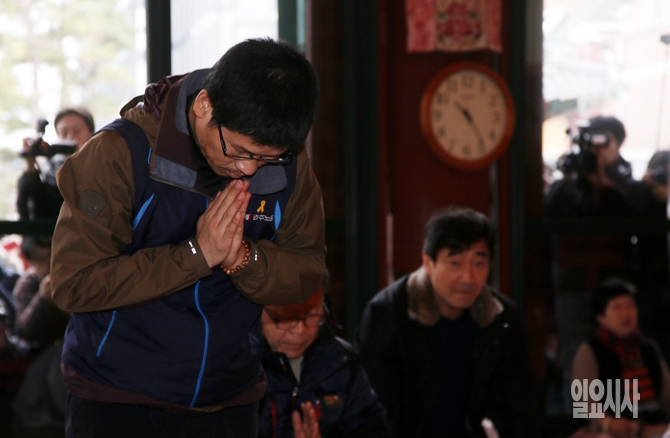 10일 오전 한상균 민주노총위원장이 은신하던 조계사에서 자진 퇴거를 결정하고 대웅전에서 참배를 하고 있다. (사진공동취재단)