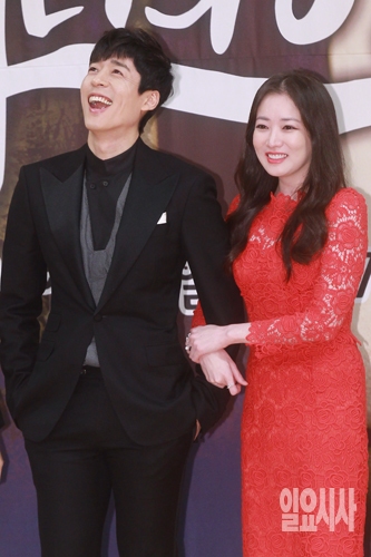 배우 서지석이 10일 오후 서울 양천구 목동 SBS 사옥에서 열린 드라마 <마녀의 성> 제작발표회에서 포토타임을 위해 최정원이 팔짱을 끼자 크게 웃고 있다.
