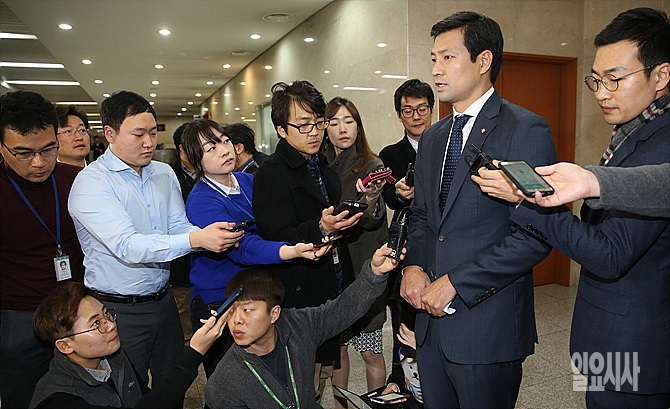 22일, 서울 여의도 국회 정론관 앞에서 새누리당 문대성 의원이 20대 총선 불출마 기자회견 직후, 취재진의 질문에 답변하고 있다.
