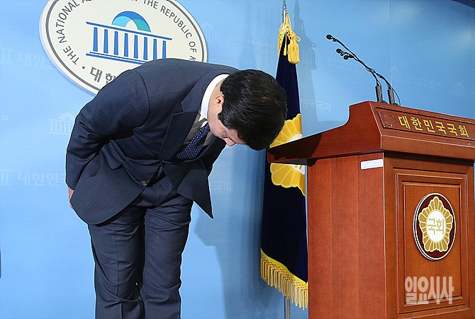 22일, 서울 여의도 국회 정론관 앞에서 새누리당 문대성 의원이 20대 총선 불출마 기자회견 직전, 취재진에게 인사를 하고 있다.