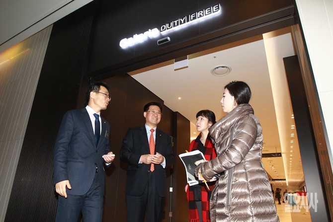 황용득 한화갤러리아 대표이사가 22일 오전 서울 여의도 63빌딩에서 열린 갤러리아면세점 63 프리오픈 행사에서 기자들과 면세점 내부를 둘러보며 대화를 나누고 있다.