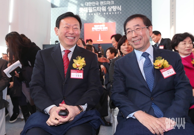 신동빈 롯데그룹 회장(왼쪽)과 박원순 서울시장이 22일 오후 서울 잠실 롯데월드타워 76층에서 진행한 '롯데월드타워 상량식'에서 대화를 나누며 환하게 웃고 있다.