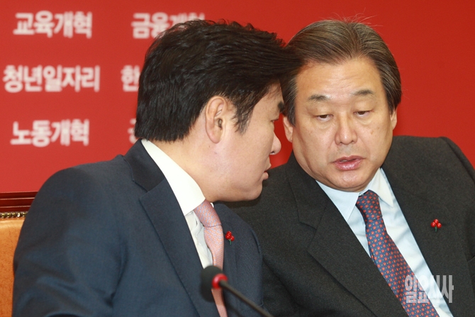 새누리당 김무성 대표와 원유철 원내대표가 23일 오전 서울 여의도 국회에서 열린 새누리당 최고중진연석회의에서 대화를 나누고 있다.