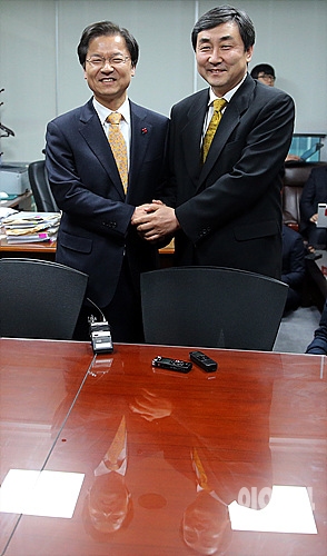 23일, 서울 여의도 국회 의원회관에서 무소속 천정배 의원(사진 왼쪽)과 새정치민주연합 이종걸 의원이 회동에 앞서 반가움의 악수를 나누고 있다.