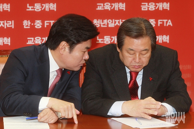 새누리당 김무성 대표와 원유철 원내대표가 24일 오전 서울 여의도 국회에서 열린 새누리당 최고위원회의에서 논의를 하고 있다.