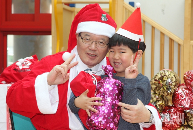 크리스마스 이브인 24일 오전 정의화 국회의장이 국회 어린이집을 찾아 어린이들에게 선물을 나눠주고 있다.