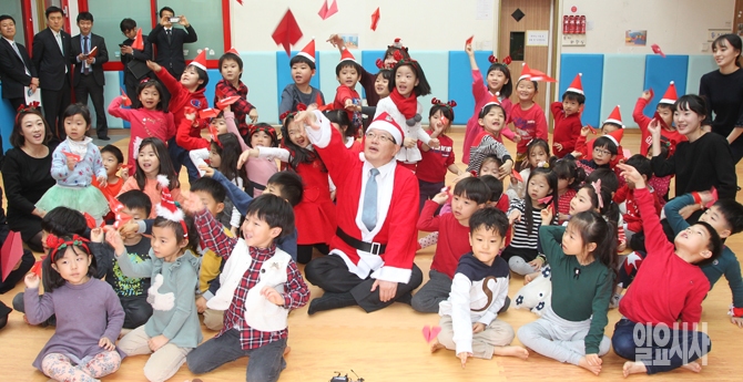 크리스마스 이브인 24일 오전 정의화 국회의장이 국회 어린이집을 찾아 어린이들과 종이비행기를 날리고 있다.