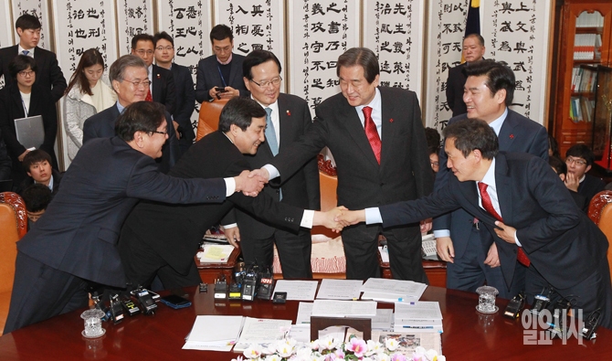 24일 오후 서울 여의도 국회에서 정의화 국회의장의 주재로 열린 여야 대표-원내대표 2+2 회동에서 여야 지도부가 인사를 나누고 있다.