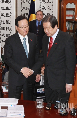 24일 오후 서울 여의도 국회에서 정의화 국회의장의 주재로 열린 여야 대표-원내대표 2+2 회동에서 정의화 국회의장과 김무성 새누리당 대표가 악수를 하고 있다.