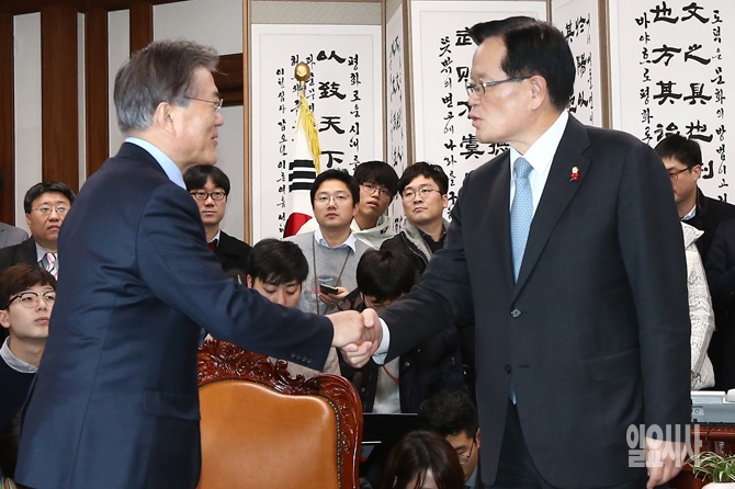 정의화 국회의장과 문재인 새정치민주연합 대표가 24일 오후 서울 여의도 국회에서 정의화 국회의장의 주재로 열린 여야 대표-원내대표 2+2 회동에서 악수를 하고 있다.