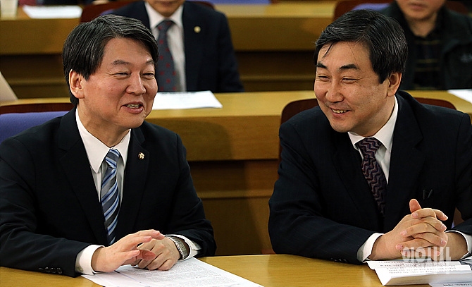28일, 서울 여의도 국회서 '정치혁신을 위한 선거제도 토론회'에 앞서 안철수 무소속 의원과 이종걸 새정치민주연합 의원이 참석해 웃으며 이야기를 나누고 있다.