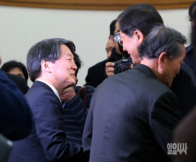 28일, 서울 여의도 국회서 열린 '정치혁신을 위한 선거제도 토론회'에 앞서 안철수 무소속 의원과 천정배 의원이 웃으며 이야기를 나누고 있다.