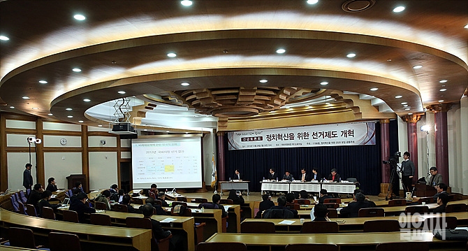 28일, 서울 여의도 국회서 무소속 천정배·안철수 의원, 새정치민주연합 이종걸 의원, 정의당 정진후 의원 등이 참석한 가운데 '정치혁신을 위한 선거제도 토론회'가 열리고 있다.