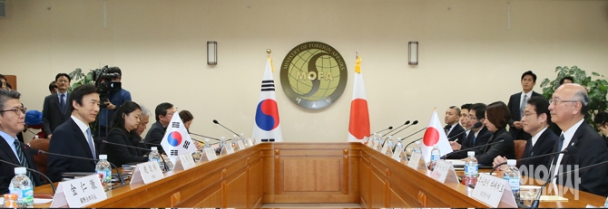 윤병세 외교부 장관과 기시다 후미오 일본 외무상이 28일 오후 서울 외교부 청사에서 위안부 문제 해결 방안과 관련한 회담을 시작하고 있다.