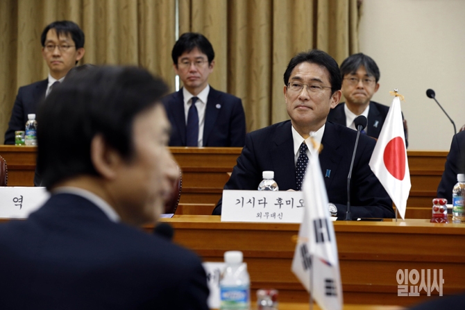 윤병세 외교부 장관과 기시다 후미오 일본 외무상이 28일 오후 서울 외교부 청사에서 위안부 문제 해결 방안과 관련한 회담을 시작하고 있다.