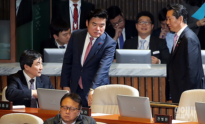 28일, 서울 여의도 국회 본회의장에서 338회 국회 본회의 임시회가 열린 가운데, 본회의에 앞서 새누리당 원유철 원내대표(사진 가운데)와 이종걸 원내대표가 심각한 표정으로 이야기를 나누고 있다.