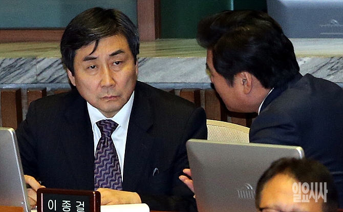28일, 서울 여의도 국회 본회의장에서 338회 국회 본회의 임시회가 열린 가운데, 본회의에 앞서 새정치민주연합 이종걸 원내대표(사진 왼쪽)가 새누리당 원유철 원내대표에게 이야기를 들으며 심각한 표정을 짓고 있다.