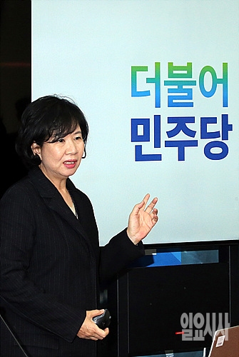 28일, 서울 여의도 국회서 손혜원 새정치민주연합 홍보위원장이 '더불어민주당'으로 당명이 개정됐음을 알리는 기자회견을 갖고 있다.