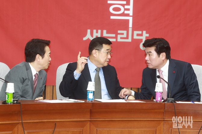 남경필 경기도지사가 29일 오전 서울 여의도 국회에서 열린 새누리당 원내대책회의에서 새누리당 김정훈 정책위의장, 원유철 원내대표와 대화를 나누고 있다.