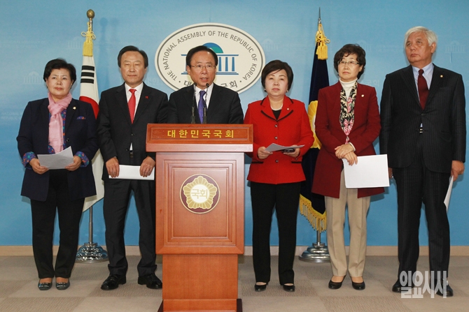 이주영 저출산 대책 특위원장과 특위 소속 위원들이 29일 오전 서울 여의도 국회 정론관에서 저출산 대책과 관련하여 기자회견을 갖고 있다.