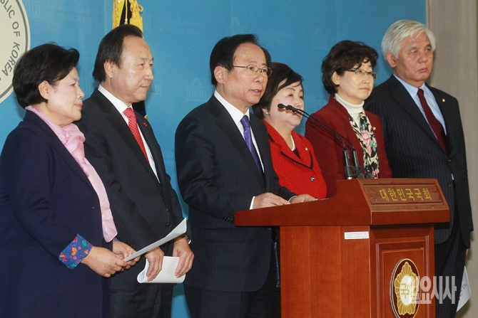 이주영 저출산 대책 특위원장과 특위 소속 위원들이 29일 오전 서울 여의도 국회 정론관에서 저출산 대책과 관련하여 기자회견을 갖고 있다.