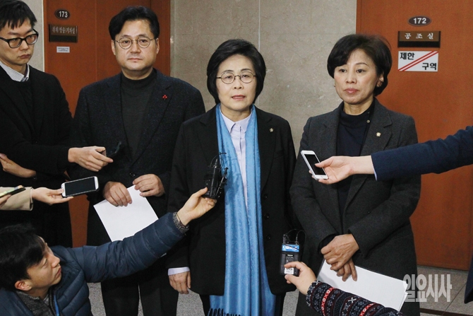 국회 여성가족위원회 소속 더불어민주당 유승희, 남인순, 홍익표 의원이 29일 오전 서울 여의도 국회 정론관에서 가진 위안부 문제 한일 외교장관 회담 결과에 대한 기자회견 후 기자들의 질문에 답변하고 있다.