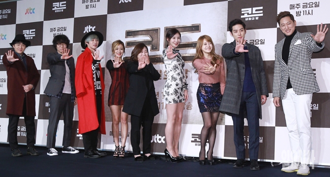 29일 오전 서울 마포구 상암동 스탠포드호텔에서 열린 JTBC 새 예능프로그램 <코드-비밀의 방> 제작발표회에서 프로그램 출연자들이 단체 포토타임을 갖고 있다.