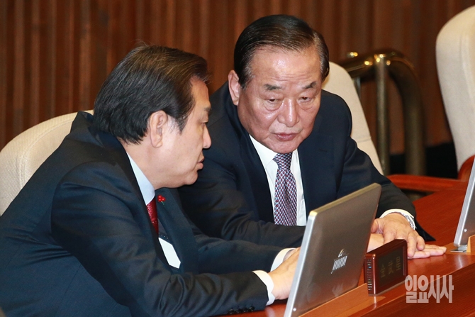 새누리당 김무성 대표와 서청원 의원이 8일 오후 서울 여의도 국회에서 열린 본회의에서 대화를 하고 있다.