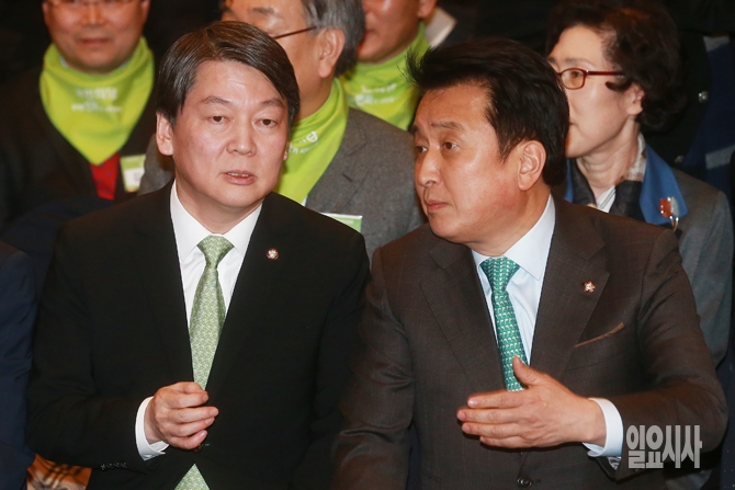 국민의당 창당을 추진하고 있는 무소속 안철수(왼쪽), 김영환 의원이 10일 오후 서울 종로구 세종문화회관 세종홀에서 열린 국민의당 창당발기인대회에서 대화를 나누고 있다.