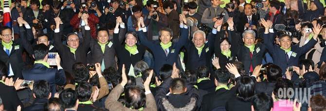 국민의당 창당을 추진하고 있는 한상진 서울대 명예교수와 무소속 안철수, 김한길 의원 등 주요 관계자들이 10일 오후 서울 종로구 세종문화회관 세종홀에서 열린 국민의당 창당발기인대회에서 포토타임을 갖고 있다.