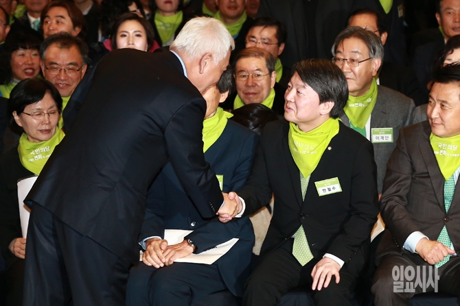 안철수 신당에 합류한 무소속 김한길 의원이 10일 오후 서울 종로구 세종문화회관 세종홀에서 열린 국민의당 창당발기인대회에서 무소속 안철수 의원과 인사를 나누고 있다.