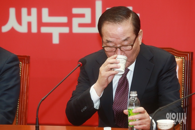 서청원 새누리당 최고위원이 11일 오전 서울 여의도 국회에서 열린 새누리당 최고위원회의에서 물을 마시고 있다.