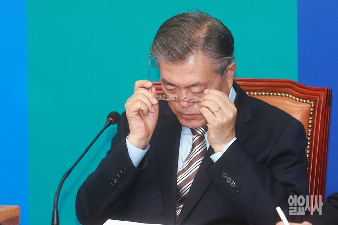 문재인 더불어민주당 대표가 11일 오전 서울 여의도 국회에서 열린 더불어민주당 최고위원회의에서 안경을 착용하고 있다.