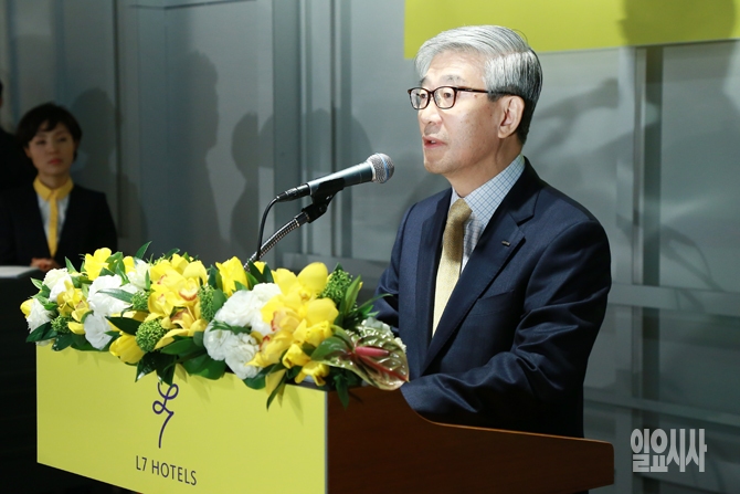 송용덕 롯데호텔 대표이사가 11일 오전 서울 중구 퇴계로 L7호텔 명동에서 열린 L7명동 프레스 초청 간담회에서 인사말을 하고 있다.