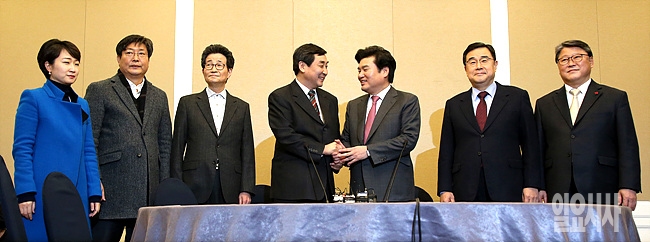 11일, 서울 여의도 국회서 원유철(사진 오른쪽서 세 번째)·이종걸 여야 원내대표(오른쪽서 네 번째)가 악수를 나누고 있는 가운데, 김정훈·이목희 여야 정책위의장, 이춘석·조원진 원내수석부대표 등이 선거구획정 논의를 위한 '3+3회동'에 앞서 기념촬영을 하고 있다.