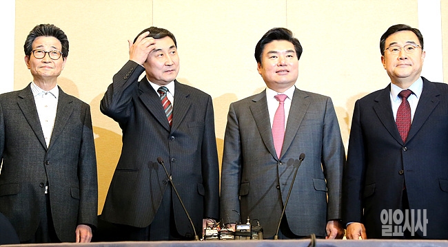 11일, 서울 여의도 국회서 원유철(사진 오른쪽서 두 번째)·이종걸 여야 원내대표(왼쪽서 두 번째), 김정훈(오른쪽)·이목희 여야 정책위의장이 선거구획정 논의를 위한 '3+3회동'에 앞서 기념촬영을 하고 있다.